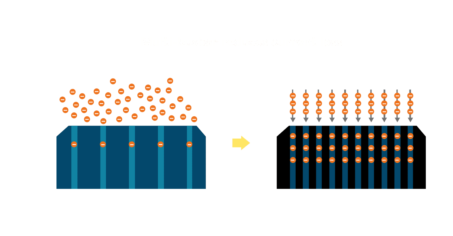 - 电池使用多条铜导线 (Copper wire) 于电池片上形成较短的电流路径,,,提高电流收集效率,,,采用圆形设计的铜导线较传统扁平式的铜焊带 (Ribbon),,可增加入射至电池的光线量。。