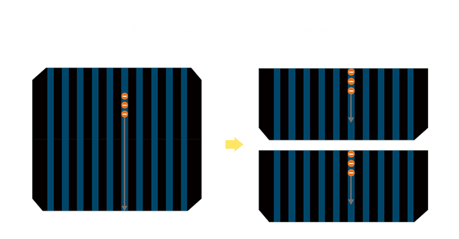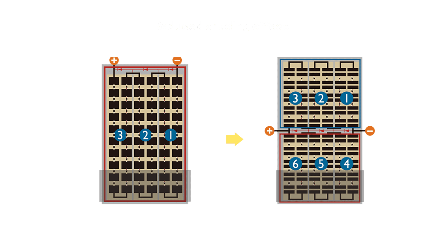 - 结合半切电池,,,,降低遮阴影响、、、提升模组抗隐裂能力、、并减少电阻损耗,,进一步提升模组发电效能。。。